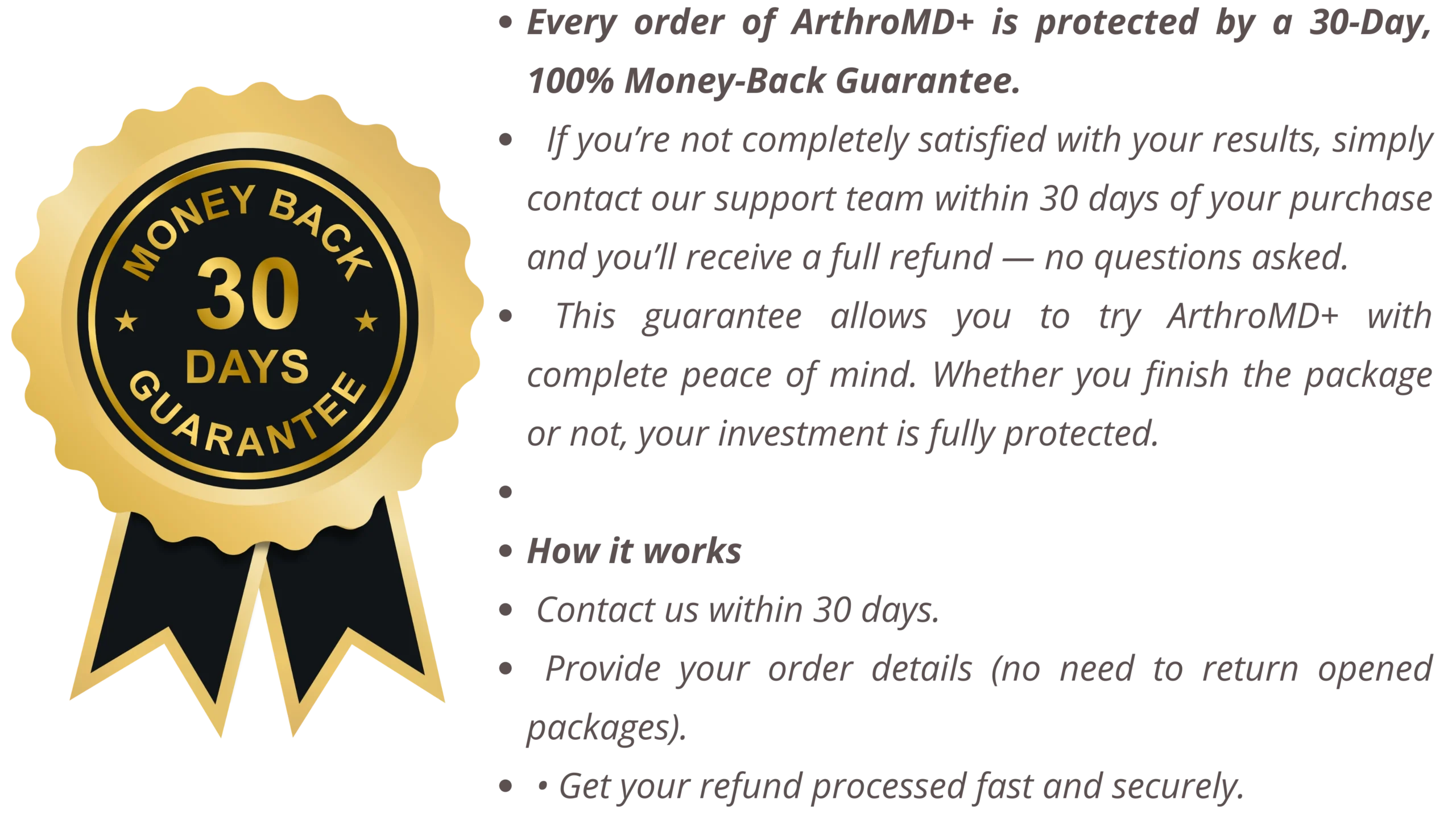 We stand behind ArthroMD+ with a full 30-day money-back guarantee — no questions asked.